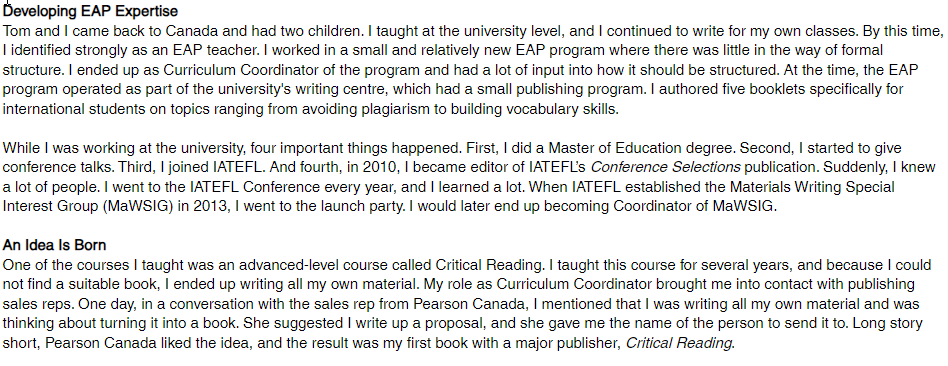 Tania Pattison gives a comprehensive description of her journey from teacher to a materials writer and curriculum developer.