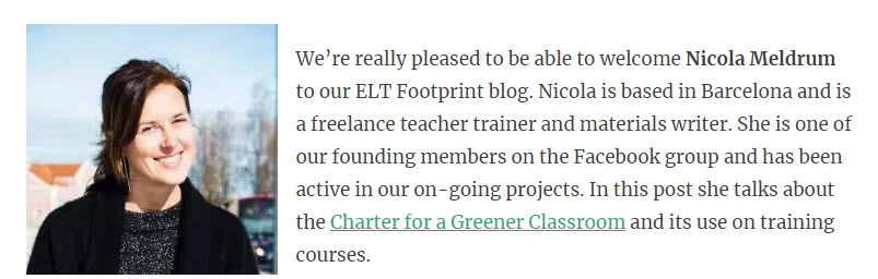 Nicola Meldrum on the ELT Footprint blog writes about what teacher trainers can do to teach in a low impact way . Nicola is based in Barcelona and is a freelance teacher trainer and materials writer.