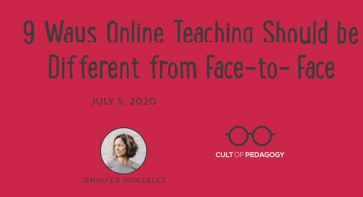 Jennifer Gonzalez outlines 9 ways that teaching online should differ from the regular, run of the mill classroom instruction. Also, see our own 15 Best Practices for Online Teaching.